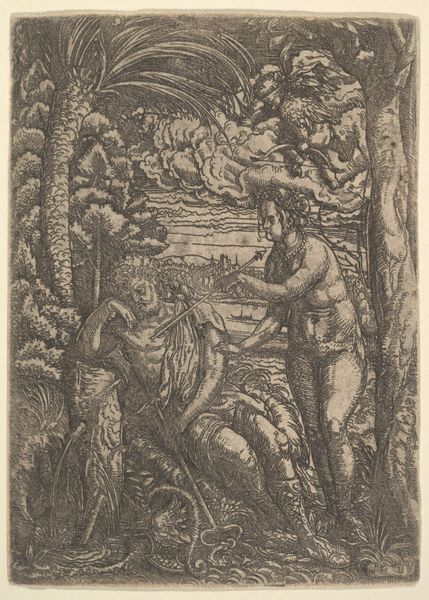 Heinrich Aldegrever created this engraving of Saturn in 1539, as part of "The Seven Planets" series. The artwork is made using the intaglio printmaking technique, where the image is incised into a metal plate, then filled with ink and pressed onto paper. The linear quality of the engraving defines Saturn’s form, using carefully placed lines to create shading and texture. Consider the sharp, precise marks required to create this miniature world, a skill honed through years of practice as a goldsmith. Aldegrever's choice of this process reflects the cultural and social context of the Northern Renaissance, where printmaking enabled the wider distribution of images and ideas. The engraving process also speaks to the amount of labor involved in creating the artwork, where the artist had to meticulously cut each line into the metal plate. The texture and tone in the print are all made using labor intensive methods. By focusing on the material and making of this print, we gain a deeper understanding of its cultural significance. It challenges traditional notions of fine art by highlighting the role of craft, labor, and the artist's social context in shaping its meaning.