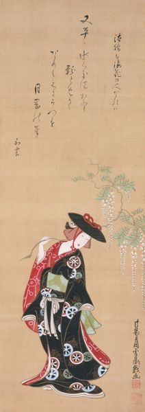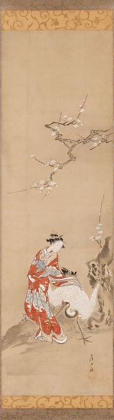 Chōbunsai Eishi's "The Salt Maidens, Murasame with Yukihira's Hat," is a vertical scroll print that invites us into a world of subtle color and serene composition. Notice how the artist uses muted tones and flowing lines to depict the figures and landscape. The soft grays and reds of the figures' robes contrast gently with the pale background, creating a sense of harmony and balance. Eishi’s approach to composition— the strategic placement of the figures, the tree, and the distant moon— draw your eye across the surface of the paper. The subject, taken from classical Japanese literature, speaks to themes of longing and remembrance. The maidens, associated with the production of salt, are figures of labor transformed into emblems of cultural memory. Eishi's delicate lines and restrained palette invite contemplation on the fleeting nature of beauty and the enduring power of art. The formal arrangement of the scene functions as a visual poem, one that continues to resonate across time and culture.