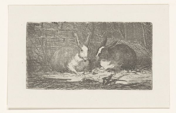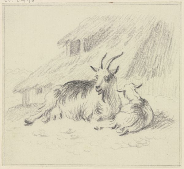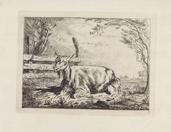 This tranquil landscape featuring a goat and its kid was likely made in the early 19th century by Pieter Bartholomeusz. Barbiers using a printmaking technique. Look closely, and you'll see it's not a straightforward etching or engraving. The image has a soft, almost painterly quality, achieved through a method called aquatint. This process involves applying a porous ground to a metal plate, then exposing it to acid. The acid bites around the grains of the ground, creating a textured surface that holds ink. It's a painstaking process, demanding skill and precision. Aquatint allowed artists like Barbiers to mimic the tonal range of watercolor drawings. It was popular among printmakers catering to a growing middle class, eager for affordable art. The scene itself evokes a sense of rural simplicity, a retreat from the industrialized world that was rapidly transforming the Netherlands at the time. Ultimately, this print invites us to consider the relationship between handcraft, mechanical reproduction, and the changing landscape of labor and leisure in the 19th century.