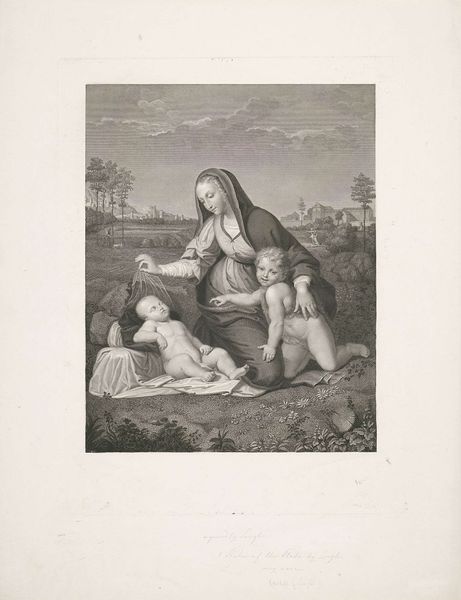Curator: Auguste Gaspard Louis Boucher Desnoyers completed this design, "The Virgin of the Rocks," sometime before his death in 1857. It currently resides in the Harvard Art Museums. Editor: It's like stepping into a dream. The figures emerge from this shadowy, grotto-like space, and you're not quite sure what's real and what's not. Curator: Desnoyers’s engraving meticulously captures the atmospheric perspective and sfumato that Leonardo da Vinci originally mastered. Considering the historical context, this work becomes a powerful representation of artistic influence. Editor: Absolutely. There's a tension here, too, between the maternal tenderness of the Virgin and the almost unsettling wilderness surrounding them. Curator: This tension resonates deeply with contemporary discussions around nature and its relationship to the divine feminine. Editor: It makes you wonder what stories these rocks could tell, doesn't it? Curator: Indeed, and that's where the true power of art lies, in the stories and dialogues that echo through time. Editor: I love how a copy of a famous piece can be so provocative.