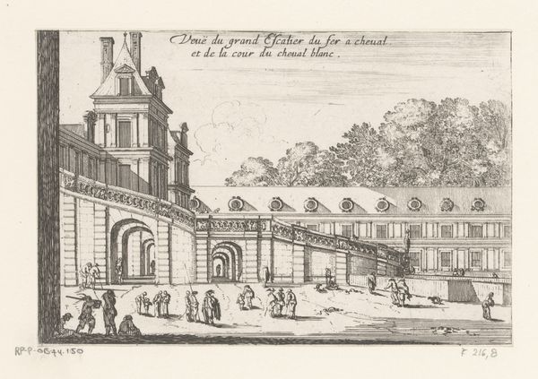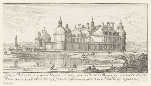 Editor: Here we have "View of English Parterres with a Large Fountain and Waterfalls," an engraving by Israel Silvestre, dating back to 1656. I'm struck by the almost dreamlike quality of the scene, the way the rigid geometry of the gardens is softened by the delicate lines and bustling figures. What’s your read on this piece? Curator: It does whisper of dreams, doesn't it? This image offers us a window into the aspirations of the time. These elaborate gardens were statements, visual declarations of power and control over nature. Think of Versailles; these carefully designed landscapes became extensions of royal authority. Do you see how the artist balances detail with open space? Editor: I do! There is this really rigid symmetry of a baroque style on the gardens that you point out and then it softens as the viewers enter the gardens… the open sky perhaps? Curator: Precisely! It’s also about presenting an ideal. Notice how flawlessly everything is rendered, the illusion of perfectly manicured nature. It's an invitation to imagine oneself strolling through this constructed paradise, breathing rarified air, insulated from the grittier realities outside. Who wouldn't want that escape? It is after all a print! Editor: That's a good point, it really highlights how art can create these aspirational worlds, detached from daily life. I never considered the socio-political context of gardens before; that really gives it a new layer. Curator: Yes, sometimes, a garden isn’t just a garden! This conversation helps me appreciate Silvestre’s technical skill even more – the ability to convey this level of detail in an engraving, it’s breathtaking!