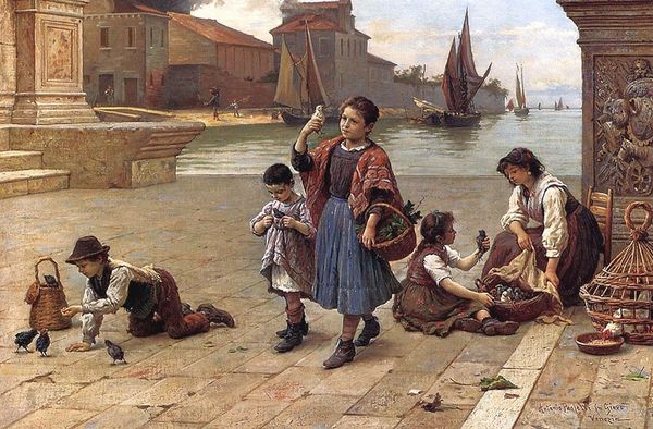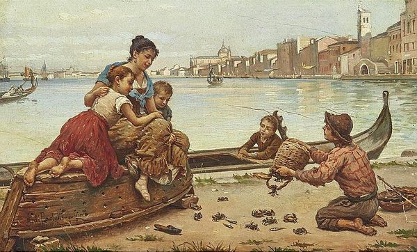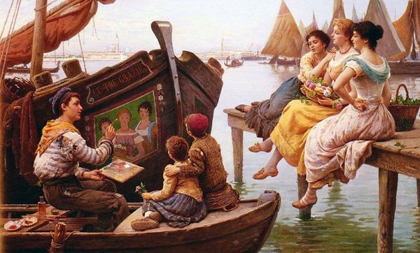 Antonio Paoletti painted "Young Sellers," capturing a street scene in Venice, a city undergoing significant changes in the late 19th century due to industrialization and tourism. Paoletti situates a well-dressed woman and her children negotiating with a young boy selling produce from a boat. The artist evokes an emotional landscape that explores themes of labor, class, and the performative aspects of everyday life. While the painting romanticizes Venice, we must remember the historical context of child labor and economic disparities that shaped the lives of many Venetians. Paoletti captures a fleeting moment of interaction, yet it invites us to consider the broader social dynamics at play. The work reflects how identity and social roles are intertwined in a specific time and place.