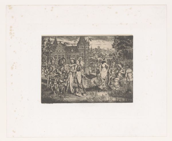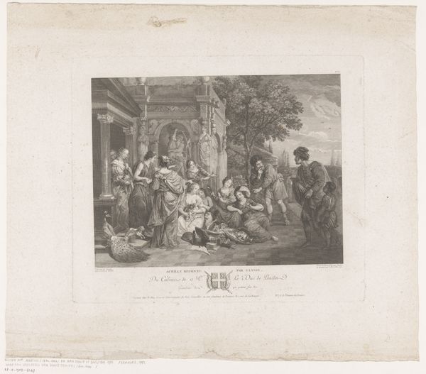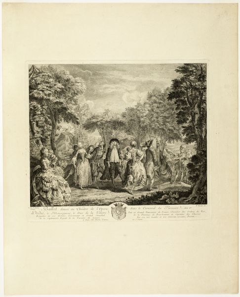 Curator: So, let’s discuss "The Dance Hall", an etching and engraving print by Pierre François Basan. What strikes you initially about this piece? Editor: Well, it’s got a bustling energy. There are so many figures, all interacting, and the architecture feels both grand and slightly decaying. It’s busy and full of life, almost chaotic. What do you see in this work? Curator: I see a snapshot of societal structures and performance. Notice the clear segregation within the space - the figures on the balcony, almost observing the "dance hall" participants. It’s a representation of class and the act of looking, a powerful gaze reminiscent of the panopticon. This artwork operates almost as a stage set. Are these celebrations inclusive or simply performative? Editor: That's a great point, I didn't really consider the class implications there! Do you think that's maybe highlighted by the fact that it looks more like a performance or show rather than something 'natural'? Curator: Exactly. It’s worth pondering what kinds of identities were welcome here, who had the ability to 'perform' and be seen, and at what cost? Was it liberating or confining? Did certain kinds of expression and behaviors occur because of this context? Think about the gender dynamics present. How do these figures enact gender roles, and who is watching? Editor: Thinking about performance, there's a performative element to class too. The "natural" behaviors we think of might actually be coached. Curator: Precisely. It's about access, power, and visibility. Understanding that, and challenging that, is important. This print, while seemingly depicting a festive scene, becomes a complex statement about societal performances. Editor: I never thought I could interpret so much about this dance scene; seeing the elements of class and performance at play is pretty revealing. Curator: Art gives us an arena in which to critically question assumptions of the world. And like the subjects of art itself, our critical lens evolves through observation and discourse.