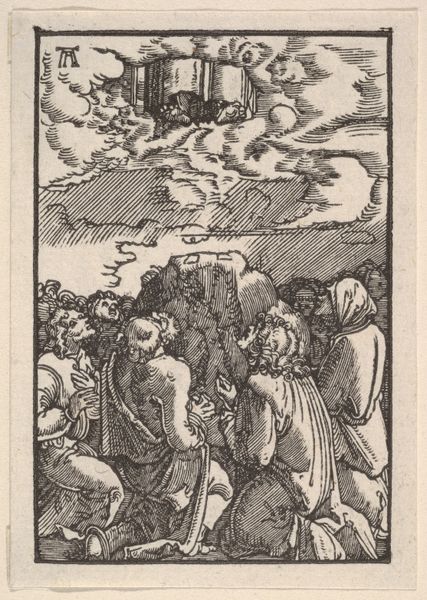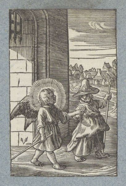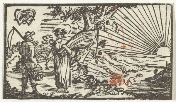 Curator: This image, titled "Februari," is a 17th-century print, a pen drawing using ink, and a woodcut by an anonymous artist. Editor: My immediate impression is of stark contrasts and dense patterning; the artist achieved a range of tonal values, it feels wintry. Curator: Indeed. “Februari" exemplifies the era's interest in portraying daily life, capturing the common people engaged in seasonal activities, perhaps referencing socio-economic hierarchies. The work would likely have been made as part of a series representing the months. Editor: The composition has an almost diagrammatic quality, doesn’t it? The sharp lines create strong shapes, especially in the architecture on the left side; see how the stark geometry contrasts the more organic, flowing lines of the figures. Curator: These series were part of a larger tradition of almanacs and calendars, intended to be functional. But they also served as vehicles for conveying societal values, ideas about labor, and even political messages, as literacy and access to images expanded within certain segments of society. Notice the astrological symbol above... Editor: Yes! Visually anchoring it in time… it adds a layer of meaning to what seems at first a simple landscape. I am struck by how efficiently the artist used hatching and cross-hatching to create such a strong sense of depth in what is really a very flat plane. Curator: Right, the scene reminds us that people in past eras structured their lives around the changing seasons; agrarian life tied one directly to weather, planting, and harvesting. These depictions also naturalized and justified the rhythms of work that determined life. Editor: It is fascinating how this piece achieves clarity of form through the very simplicity and boldness of the lines, despite its modest scale. It makes me consider what these figures may be saying, but their gestures, even their specific clothes, feel lost now in time. Curator: The visual impact is undeniable; “Februari” invites us to reflect on the intersection of art, labor, and societal beliefs. Editor: And from a formal perspective, we appreciate the stark contrasts, dynamic composition, and linear sophistication, underscoring its timeless aesthetic power.