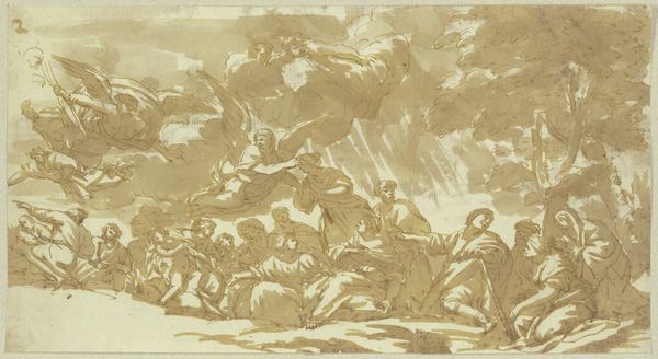 Editor: So, this is "Defeat of the Titans," an engraving by Philip van Gunst, made sometime between 1685 and 1732. It's pretty overwhelming, honestly, with all these bodies and rocks swirling around. What kind of story do you think it's telling? Curator: It's a powerful rendition of the Titanomachy, the great war between the Olympian gods and the Titans. Notice the swirling chaos, bodies falling… Van Gunst masterfully uses light and shadow here to amplify the sense of upheaval and defeat, literally and symbolically casting these giants into darkness. It speaks to the psychological weight of being overthrown. Editor: So, beyond just showing the battle, is it saying something about power? Curator: Absolutely. The Titanomachy isn't just a fight; it's about the transfer of power, a new order replacing the old. Consider what these figures represented to their original audience. The Titans often symbolize primal forces, raw and untamed, whereas the Olympians represented a more ordered, rational world. The ‘civilized’ world. Editor: That makes me think about how we still use these kinds of symbols today, like in movies. Curator: Precisely! These visual symbols persist through time. Consider how similar imagery might be used to represent conflict in modern narratives. How might an artist today depict a similar struggle for power, and what symbols might they employ? Editor: I hadn’t thought about it like that. I always saw Greek myths as old stories, but it’s interesting how the themes keep showing up. Thanks! Curator: My pleasure. The engraving reveals the endurance of these fundamental conflicts, reinterpreted for each age. Keep watching and questioning!