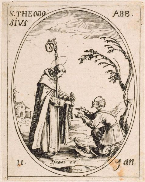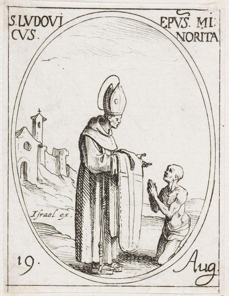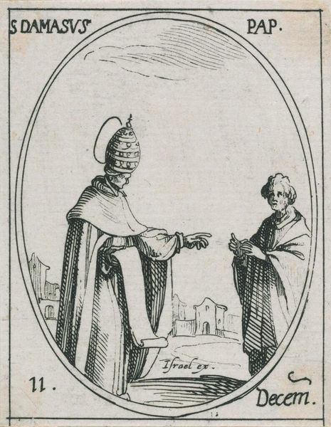 Curator: Here we have Jacques Callot's "Saint Robert," an etching measuring about 7.6 by 4.9 centimeters, currently held in the Harvard Art Museums. Editor: It’s striking how much detail Callot packs into such a small space; there's a certain solemnity to the figures. Curator: The work shows two haloed figures, presumably depicting Saint Robert receiving symbols of office. Notice the careful rendering of the robes, highlighting the textile production and sumptuary codes of the period. Editor: Yes, the linear quality of the etching emphasizes the folds and textures, creating a dynamic play of light and shadow that almost feels sculptural. Curator: The printmaking process itself is worth noting; etching allowed for mass production and dissemination of religious imagery to a broader audience. Editor: I hadn't considered its distribution, but focusing on the composition, one can really appreciate how such intricacy adds to its impact. Curator: Indeed, considering the materials and means of its creation gives us a deeper understanding.