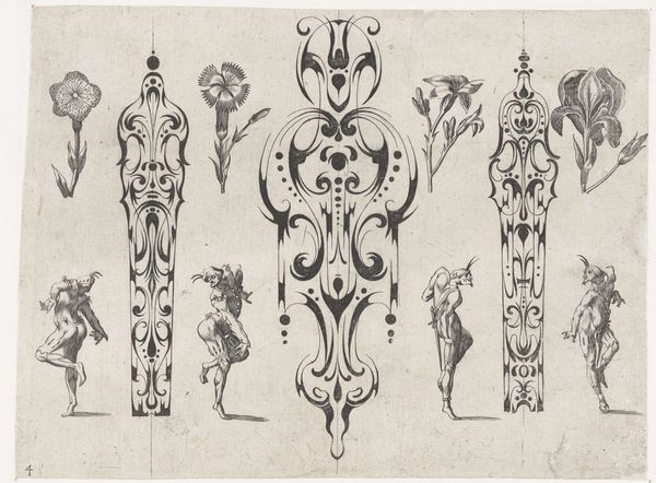 This print, by Guillaume de la Quewellerie, presents us with an array of black ornaments rendered with striking precision. These delicate forms are achieved through the process of engraving, where lines are incised into a metal plate, inked, and then transferred to paper. Here, the stark contrast between the black ink and the off-white paper is particularly striking. This technique allows for incredibly fine details, as we can see from the sinuous lines of the central lozenge, the keys, and helmet that are adorned with floral motifs. Prints like this were not intended as artworks in themselves, but as pattern sources for craftsmen. They provided inspiration for artisans working in various media, from metalwork to textiles. This print embodies the interdisciplinary nature of creativity in the early modern period, when the boundaries between art, craft, and design were more fluid than they are today. It serves as a reminder that even the most functional objects can possess a high degree of artistry.