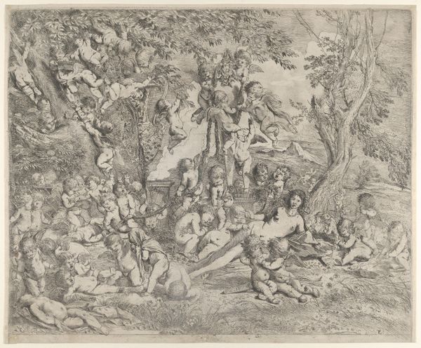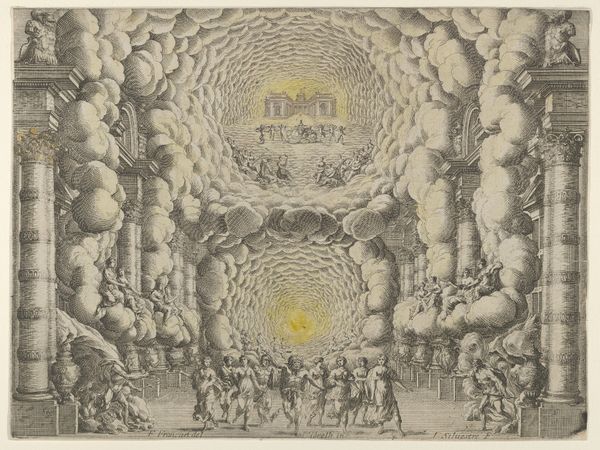 Mathäus Küsel created this set design from 'La Monarchia Latina Trionfante' using etching and engraving. The print depicts Saturn enthroned amidst allegorical figures, offering us a glimpse into the symbolic language of power and authority in the 17th century. The imagery of Saturn, who in mythology devoured his own children, sits at the heart of a complex interplay between creation and destruction, offering a meditation on the cyclical nature of time and power. Küsel situates Saturn on a throne of rubble, and this conveys the tenuousness of power, reminding us that all empires eventually crumble. Note the figures lining the walls that represent Saturn devouring children; this draws on the patriarchal theme of power and control over future generations. The set design invites us to reflect on how those in power legitimize their authority through spectacle, myth, and fear. The artwork is a potent reminder of the human cost of unchecked power.
