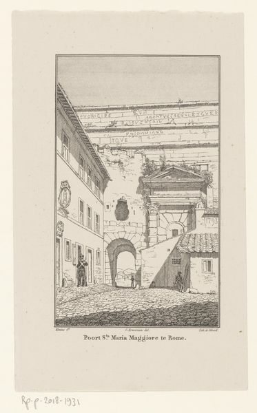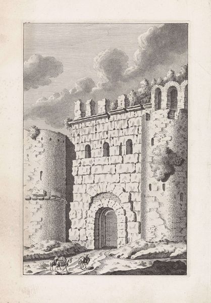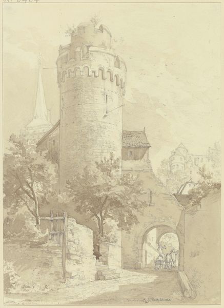 Editor: This drawing, titled "Gate to Eschenbach" is attributed to Karl Ballenberger. It appears to be pen and ink on paper. There's a really striking sense of solidity and permanence to this medieval gate; almost like it's a steadfast guardian. What do you see when you look at it? Curator: Well, I’m immediately drawn to the symbology embedded within the architecture itself. Consider the gate: throughout history, it represents not just a physical barrier, but also a threshold—a passage from one state of being to another. Does that doorway invite you in or keep you away? Editor: It seems to do both, honestly. It's sturdy and imposing, yet there's an open passage and visible staircase. Curator: Precisely! And what of the ornamentation? We see heraldic shields placed prominently on the stonework. Shields historically communicate lineage, power, protection, even group identity. Their presence connects this structure to stories beyond its physical form, whispering of social structures and allegiances long past. Have you noticed the figure on the left side of the bridge? Editor: Oh, yes! A figure looking at the outside from the bridge. The artist added the character at an eye level and it almost felt like I could associate the person to the gate myself and picture standing right next to it, imagining a character that I associate with the place. Curator: You have a sharp eye, and you can sense that visual trick, placing our point of view into the art piece! In many ways this image offers us a bridge across time, into an era where symbolism was architectural language. It makes you wonder what they meant for that period. Editor: I never thought about the heraldry and how the personification makes us relate with this artwork! I learned about art history, not symbols and iconography; the language embedded is fascinating! I’m definitely going to look closer at these elements in other artworks, to better relate with those past messages. Curator: Indeed, our task is to unpack their meaning to find something new. These artifacts, in the end, reveal cultural memory, which is pretty amazing.