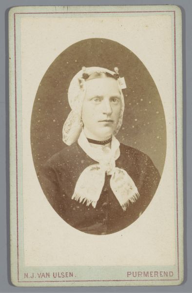 This portrait by Huijsen & Zoon captures an unknown woman, her attire speaking volumes of her cultural identity. Dominating the image is the intricate headwear, a variation of a bonnet, adorned with ribbons. These head coverings, like the veils of antiquity, were potent symbols of modesty, status, and regional belonging. Similar headpieces recur across cultures, from medieval wimples to the elaborate lace caps of the Dutch Golden Age. These are not merely aesthetic choices; they are visual declarations of one's place in society. The way such headdress frames the face draws the eye to the individual, while simultaneously obscuring, creating a play between revelation and concealment. The motif of the ribbon, tied in a delicate bow, hints at ceremonial rites of passage and connection. Ribbons appear in countless rituals, from tying the knot in marriage to adorning sacred objects. This act of tying symbolizes unity and commitment, resonating on a deeply felt, psychological level. It is a testament to the enduring power of symbols, their forms evolving through time, yet their essence remaining resonant with human experience.