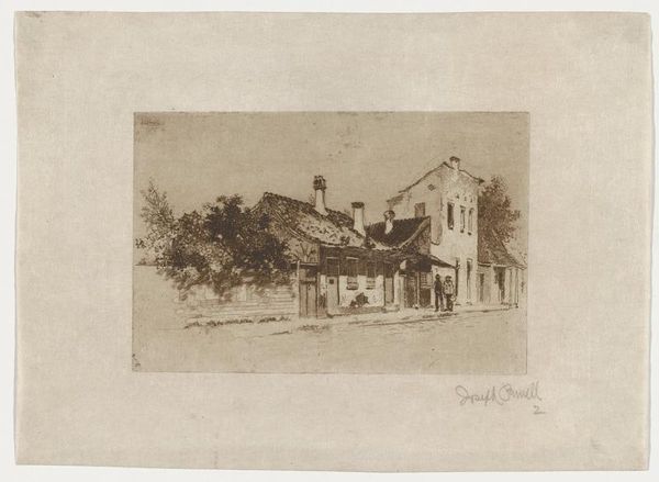 David Young Cameron created this print, "Boquhapple," employing etching to render a landscape dominated by a cluster of buildings. The composition’s success lies in Cameron’s manipulation of light and shadow, creating depth and texture across the rural scene. The linear quality of the etching technique invites an intimate viewing experience, almost as if one is tracing the lines of the landscape with their own eyes. Cameron plays with contrasts between the dense, intricate details of the buildings and the open, sparsely rendered fields. This contrast draws attention to the architectural forms, accentuating their volume and solidity against the relative emptiness of the surrounding space. The artist uses the semiotic system of landscape art to evoke a sense of place and time, subtly referencing the traditions of rural genre painting while pushing toward a more modern distillation of form. Notice how the starkness of the bare trees punctuates the skyline, offering a formal counterpoint to the horizontal spread of the buildings. This print invites continuous interpretation, revealing new aspects of its structure and meaning with each viewing.