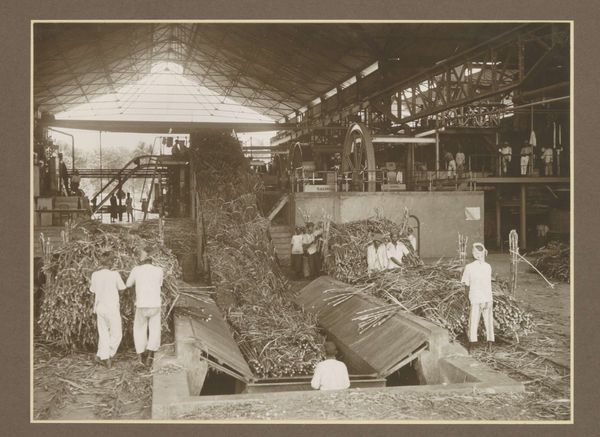 Editor: Here we have Otto Hisgen's "Rietcarrier," a gelatin-silver print from between 1917 and 1938. The photograph plunges us into an industrial space. I’m struck by the contrast between the rigid geometry of the machinery and the almost chaotic piles of what looks like hay. What story do you think Hisgen is trying to tell here? Curator: Ah, "Rietcarrier"! To me, this image sings of the often overlooked beauty within industry, a place where humanity wrestles raw materials into being. Hisgen, bless his lens, invites us to peer into a world that is both functional and surprisingly dreamlike. The man, almost lost against the backdrop, guides my gaze. Look how his stance echoes the lines of the machinery. It's like a ballet of man and machine, don’t you think? Editor: A ballet? I hadn’t considered that! I saw a sort of grimness. Curator: Grimness, yes, perhaps a layer. But peek deeper. Doesn't the light catch the straw in a way that makes you feel it's not just raw material, but something with its own humble grace? It's the poetry of labor. And tell me, does that blend of nature and machine make you consider our place in the landscape of industry? Editor: That’s true. Now that you point it out, there's a kind of quiet dignity in his work, and the materials he works with. Curator: Exactly! Art often hides in plain sight. What starts as documentation blossoms into a reflection of ourselves, caught in the gears of progress. Don't you just adore when that happens? Editor: I think I do now. I'll never look at industrial photography the same way again!