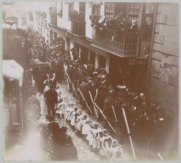 This photograph captures Queen Juliana's golden carriage on her wedding day in The Hague, back in 1937. It's a pretty grand affair, and even in monochrome, the image radiates a sense of tradition and ceremony. What strikes me is the contrast between the ornate, almost baroque detail of the carriage, and the relatively simple, stark architectural backdrop. The carriage itself is a riot of sculptural elements, each curve and flourish meticulously rendered. It’s like the photographer wanted to capture every single detail, freezing it in time, and emphasizing the material weight of history. Look at the top of the carriage, crowned with figures, you can almost feel the weight of expectation, of history, pressing down. The people in the photograph, almost like figures in a landscape painting, they're part of this tableau of power, tradition, and well, perhaps a bit of fairytale magic too. You know, like something from a Josef Albers painting, only with horse-drawn coaches instead of geometric shapes. It shows how even documentation can embrace drama and multiple interpretations.