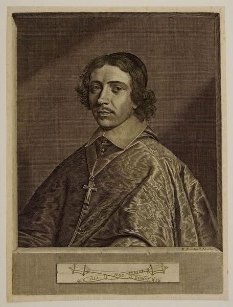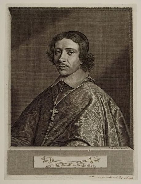 Editor: Here we have Robert Nanteuil's 1650 engraving, "Jean-François-Paul de Gondi, Le cardinal de Retz," currently residing at the Metropolitan Museum of Art. It’s fascinating how Nanteuil manages to convey such intricate detail in a printed portrait. What strikes you most about its visual composition? Curator: Note the almost tangible rendering of fabrics. Nanteuil coaxes the viewer to accept the visual sensation as a three-dimensional truth. How does the textural variation from skin to fabric interplay with the linework's inherent flatness? Is there a tension between these dueling qualities, or do they achieve a synthesis of form? Editor: I see what you mean about the fabric, it's very convincing. But isn’t there also a contradiction? The detailed clothing suggests wealth and status, while his face seems surprisingly… vulnerable? Curator: Precisely! The artist offers two competing visual grammars, and both vie for interpretive authority. Consider also how the inscription further informs our understanding, framing our reception of the visual elements and how they synthesize. Editor: I hadn’t even noticed the inscription. So the arrangement of elements, the way textures contrast, and even textual additions contribute to the overall… message, would you say? Curator: It is through the precise orchestration of line, texture, and inscription that we may begin to glimpse an argument crafted through purely visual means. Editor: That's a fantastic way to think about it. I’ll definitely look at engravings differently now. Curator: Indeed. Art invites such recalibrations, offering fresh avenues into the familiar.