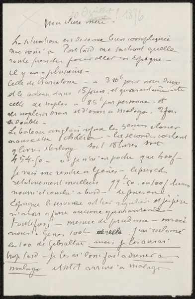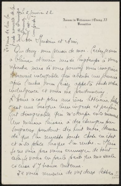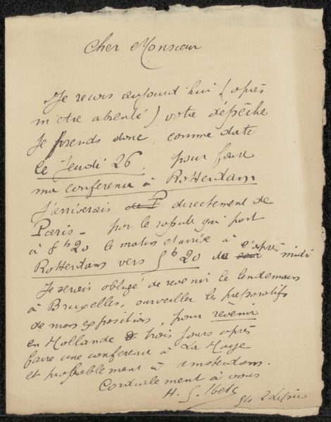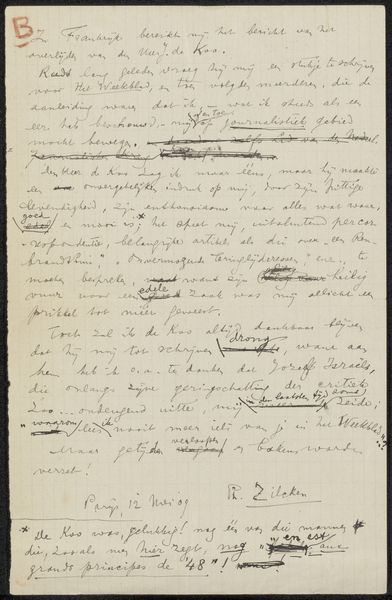 Editor: This intriguing piece is called "Brief aan anoniem," which translates to "Letter to Anonymous," created sometime between 1901 and 1925 by Philip Zilcken. It’s an ink drawing on paper, held at the Rijksmuseum. The density of the handwriting almost creates a visual texture, an abstract shape… it’s fascinating! What do you see in this piece, from a formal perspective? Curator: Indeed. It’s quite rewarding to approach this work primarily as a formal construction. Notice how the script isn't simply text, but rather a network of lines, almost woven together. Observe the variations in the ink's density and pressure – how they create depth and rhythm on the page. Editor: Yes, the lines are very rhythmic. They're controlled, but with a certain nervous energy. Almost musical! Curator: Precisely. It's crucial to examine the page's composition; note the empty spaces versus the densely filled areas. The negative space gives the eye a place to rest amidst this intricate web. Do you observe any areas where Zilcken might have altered the initial flow of the text? Editor: I think so…there are definite strikethroughs and corrections. They feel important somehow, almost as intentional marks. Curator: Exactly. Those are powerful because they direct attention to the choices Zilcken made in composing this piece. The cancelled words and revisions serve as reminders of the artistic process itself, making it a work about writing more than the writing itself. We must be cognizant of this effect as integral to the overall piece. Editor: That’s a brilliant point. I had been focused on trying to decipher the writing, but understanding it as an object… opens it up in a new way. Curator: I concur entirely. Examining the letter solely for its semantics diminishes the potency of this artwork as a confluence of script and art form. Editor: I’ll definitely look at handwriting differently after this. Thanks!