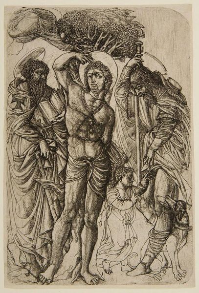 Curator: Here we have John Skippe’s “Persian Sibyl,” a print held within the Harvard Art Museums. What strikes you? Editor: It's austere, isn't it? The cool blue tone, the cross-hatching. It feels less like a glimpse into prophecy and more like a diagram. Curator: Indeed. Skippe's technique emphasizes line and form. Notice how the drapery and the figures behind the sibyl create a complex interplay of light and shadow, almost a stage set. Editor: A diagram, maybe a blueprint for a play about fortune telling! She’s peering at her lines; everyone is waiting. You know, I rather like this interpretation. Curator: A compelling reading! It underscores the performative aspect, that the sibyl's role is, in effect, theatrical. Editor: It’s always refreshing to see an artist’s mark presented with such clarity. It gives me hope. Curator: As it should.
