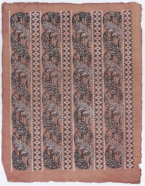 Curator: Here we have an intriguing, if somewhat understated, piece. It’s called “Sheet with four borders with a garland of acanthus leaves and flowers,” created sometime between 1775 and 1875 by an anonymous artist. It’s currently held at the Metropolitan Museum of Art. Editor: My first impression is, perhaps unsurprisingly, wallpaper. It has that regimented repetition and faded elegance about it. Curator: Precisely. And while we don’t know the artist's name, its purpose feels evident. These drawings or prints would’ve been meant for practical applications, probably wallpaper or fabric design. I find the ghostly pale greens and pinks rather haunting. Editor: Right, this color palette feels very… specific to a certain kind of aristocratic interior, evoking those powdered-wig, pre-revolution sensibilities. Were these patterns also implicitly statements of class or belonging? Curator: Absolutely. The acanthus leaves, a motif borrowed from classical architecture, signals taste and refinement. Remember, access to design and decorative arts has always been unevenly distributed, mirroring societal inequalities. Editor: The regimented symmetry, that enforced harmony, it contrasts rather harshly with the real, often messy lives of people living with such ornamentations around them. I find myself wondering who labored to create these patterns and how this artistry was perceived in that era. Curator: Indeed, whose stories are suppressed within these decorative frills? This makes you consider not only the artistry and design itself, but what it represented socially, doesn't it? The artist and engraver, who probably belonged to a printing business workshop, remained uncredited, their personal artistic freedom surrendered to their task. Editor: Exactly. What begins as an appreciation for pattern-making quickly unfolds into deeper questions of labor, class, and access to creative expression. I keep circling back to the contrast, too. The almost clinical exactness of design beside this quite imperfect handmade texture. Curator: And now I can’t help but see it that way too! Thanks to the uneven colors, it becomes a poignant memento. So what starts off appearing so serene actually hides these little disruptive elements, once you stop to look. Editor: Right. In art and design, what’s not shown or explicitly stated can sometimes carry the most profound meaning. This really feels relevant when discussing questions about privilege and oppression, right?