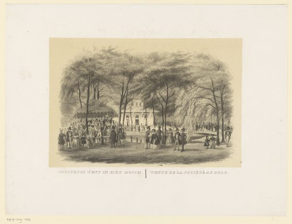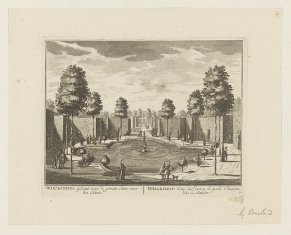 Curator: Welcome. Before us, we have an engraving from 1838 by Louis-Julien Jacottet, titled “View of the Château de Saint-Cloud in the Park of Saint-Cloud," currently held at the Rijksmuseum. Editor: It feels meticulously ordered, doesn’t it? A highly controlled landscape of cascading water features and carefully arranged topiary. The linear precision gives it a somewhat serene, even artificial, air. Curator: Indeed. This is an example of Romantic landscape with a definite sense of place. Saint-Cloud was once an important royal residence; its representation here reflects the human desire to shape nature to project order and power. The figures are small, neatly arranged; their presence emphasizes human command of this domain. Editor: What interests me are the techniques used to produce the intricate details. Look at the contrast between the light reflecting off the water and the density of the foliage. Jacottet uses a network of finely etched lines to construct a very precise sense of texture. It feels cool because the chromatic range is very narrow. Curator: I see that the fountains become central visual elements that signify purification, or even enlightenment, reflecting philosophical trends of the time. Their repeated appearance across the composition guides the eye upward toward the palace, suggesting an ascent toward higher spiritual or intellectual understanding. What do you feel about its setting within French cultural memory? Editor: The setting reinforces that. Its geometric rigidity and balanced forms reflect neoclassical ideals embedded in French garden design, highlighting a preference for rationality and control in artistic representation. Curator: That preference also extends to social order. Representations of orderly landscapes were sometimes subtle attempts to create analogous associations with political stability. Editor: A subtle reminder of human aspiration, maybe. Jacottet really created an enduring and powerful composition using carefully arranged line and tone. Curator: And we might add the power of water as a vitalizing element that flows within memory, myth, and visual form. It’s quite fascinating to consider it from all these perspectives.
