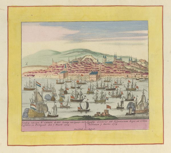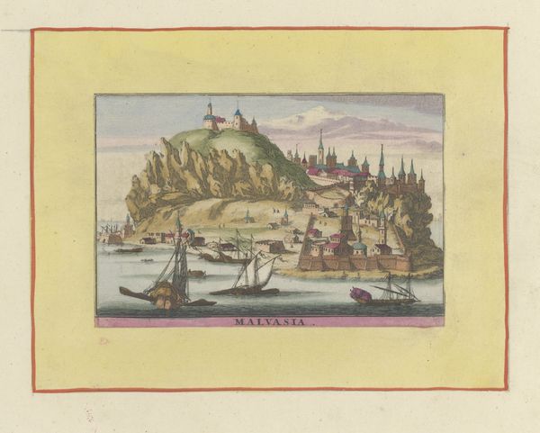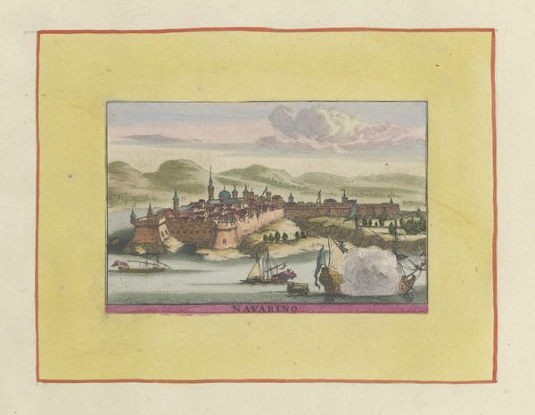 Curator: Willem Swidde probably created this artwork, entitled “Gezicht op Methoni,” sometime between 1679 and 1717. What strikes you initially about this watercolor print? Editor: It has the quality of a half-remembered dream, a pastel mirage. It’s tranquil and a little melancholy. The light feels like it’s fading, the colors softened by time. The sea foam looks like lace. Curator: Time is relevant. Consider the positionality of the Dutch Republic during the 17th century. “Gezicht op Methoni,” which translates to "View of Methoni,” presents a vision of a strategically important port city within the Ottoman Empire. We must unpack how visual representations supported Dutch mercantile and imperial ambitions. Editor: Ah, the colonial gaze! Of course, looking at this with a modern perspective, I can't help but feel a bit uneasy about romanticizing places that were surely rife with complexities and power imbalances. It is beautiful though! It captures this sort of removed elegance. Curator: The picturesque aesthetic was, in many ways, a tool of power. The artist, even from afar, actively participated in constructing an image of “the Orient.” Observe the carefully placed boats. These could signify Dutch naval presence, underscoring trade routes and perhaps also veiled threats of dominance. Editor: It makes me think of the old saying, “tranquility can be deceiving.” There's this almost theatrical quality, where everything is arranged perfectly for the viewer. So pretty and peaceful... almost too much? I bet if you zoom in, there’s quite a bit of jostling for space on the streets. Curator: Absolutely, and even the print medium is significant. Prints allowed for wider dissemination, reinforcing specific perceptions. How the city is presented here, this influenced public sentiment back home. Methoni isn't just a place; it’s a statement of Dutch influence, meticulously packaged. Editor: This discussion definitely shifts my viewpoint on Swidde's piece. It's a lot more than just a pretty watercolor. It's a little window into a world of politics and ambition masked by this lovely artistry. Thanks, I won’t look at another landscape the same way again! Curator: Nor will I. And that, ultimately, is the power of art and of reframing its telling.
