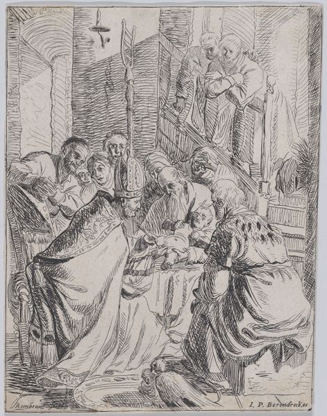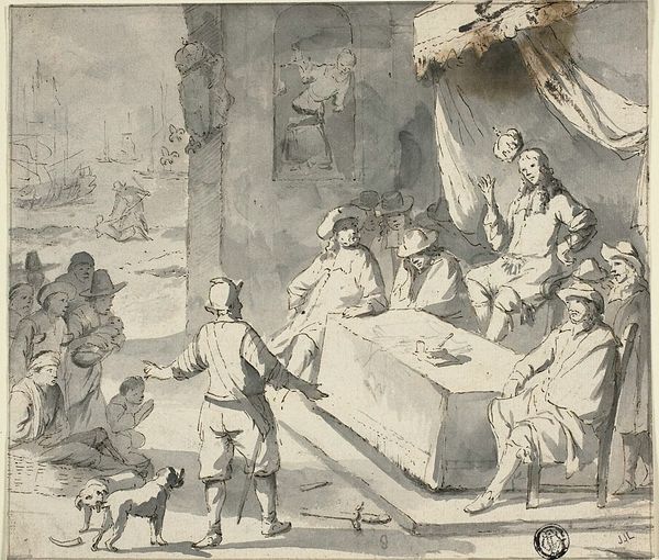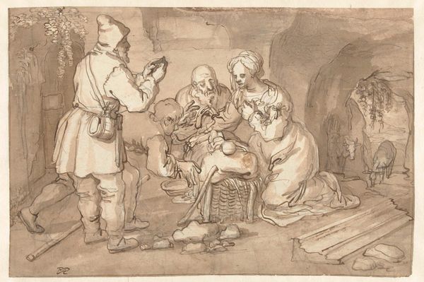 Jan Josef Horemans the Younger created this drawing, "Interior with a Family with Children," using pen and gray ink, with gray wash, in a composition measuring 263 by 349 millimeters. The use of a muted palette in shades of gray creates a somber tone, drawing attention to the family's close arrangement within the modest interior. Horemans's technique, characterized by precise line work and subtle gradations of wash, serves to underscore the emotional complexity of the domestic scene. The composition is structured to draw attention to the formal qualities of the family's arrangement. The detailed rendering of textures and surfaces—from the rough texture of the walls to the intricate folds of the clothing—invites us to consider how these elements contribute to the artwork's thematic concerns. This invites us to contemplate how art may reflect broader social and philosophical ideas about family, home, and personal identity.