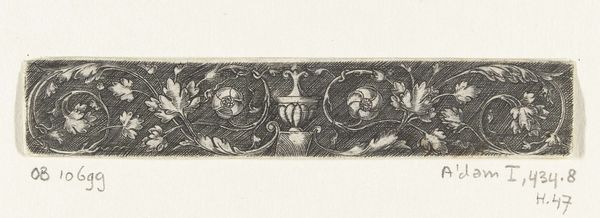 Curator: Here we have "Ornament with a Vase and Foliage," a delicate engraving by Heinrich Aldegrever, dating back to 1528. The artwork, rendered in stark lines, captures a symmetrical composition anchored by a vase, flanked by swirling acanthus leaves. Editor: It has this incredibly balanced, almost somber presence. Despite being ornamental, the rigid symmetry and contrast evoke a controlled, contemplative mood for me. Curator: Indeed, Aldegrever, a prominent figure of the German Renaissance, excelled in intricate designs intended for goldsmiths and other artisans. This particular piece reflects the Northern Renaissance interest in classical forms adapted to suit contemporary tastes and craft traditions. The vase, the geometric inscription, and the stylized foliage are meticulously arranged according to design principles echoing ancient Rome. Editor: Right, and in 16th century Germany, artistic and religious upheavals were happening with the Reformation. These intricate works might seem detached but represent the rise of humanism within religious and political upheaval. Ornamentation and design held real ideological weight, defining spaces of both wealth and religion in the midst of this transformation. Curator: Precisely. We can analyse this particular piece through its structure and lines. Notice the engraver's skill in depicting depth using hatching and cross-hatching? Each line contributes to the overall form and the way light is expressed on the surface of the leaves. Editor: And I find it equally intriguing to consider that this kind of ornamental design becomes more readily available in homes with the rise of the merchant class in Germany during that time. The ornamental aesthetic serves as both beautiful and functional; to enhance status and celebrate craftsmanship while reflecting shifts in societal and cultural expression. Curator: That contextual understanding allows for multiple readings of a small engraving like this. Editor: Exactly, which adds layers of meaning to our viewing experience. Thanks to the rich visual language present here and in Northern Renaissance artwork in general, we recognize a deep intertwining between aesthetic value, religious tension, and rising consumerism. Curator: Indeed, from the linear exactness to how design itself was becoming a tool, it all enriches this single print far beyond surface beauty.