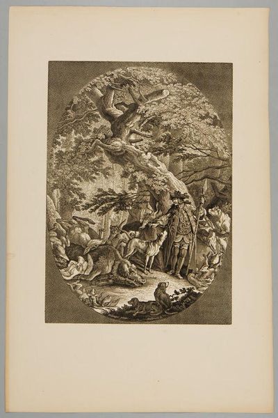 Curator: Well, this print, titled "The Song of Orpheus", created by Frank Wright, pulls us into a really intriguing narrative space, doesn’t it? The convergence of mythology, musicality, and, honestly, a kind of orchestrated chaos... What’s your initial reaction? Editor: Chaotic is definitely the word! It feels… intentionally overwhelming. My eyes jump from the winged figure brandishing what looks like an hourglass, to the scattering of figures – pierrots, common folk, and animals. It's dreamlike, almost unsettling in its density. Curator: Right. The iconography here is rich. The artist pulls elements directly from the Orpheus myth. Winged figures always represent higher states of awareness and in alchemy, they embody volatile spirit—the force able to affect change. And consider the presence of the animals... they respond to Orpheus' song, reflecting that intrinsic connection between man and nature. Editor: It’s interesting to see the juxtaposition of these mythical figures alongside figures seemingly derived from daily life—laborers or maybe farm workers on the periphery. Are we looking at a statement about who art is for? Is this music, in its purest form, meant for everyone, both ethereal beings and those tilling the soil? Curator: Possibly. In looking at the cultural moment, perhaps this hints at post-war reconciliations with an idealized vision of pre-modern life—a yearning for harmony with a more natural past. The medium—printmaking—also democratizes art production, making it more accessible, as you were implying. The lines of narrative here invite many audiences, regardless of access. Editor: It’s also intriguing that the artist chose printmaking for what seems to be a narrative steeped in high culture – Orpheus. How do you read this tension? Is it an ironic twist, bringing the elitist into reach, or does it aim to give the art object another aura? Curator: Maybe it’s about re-interpreting classic narratives in a modern social landscape. The use of accessible art materials allows Frank Wright to invite the audience to reflect not only on a Greek myth, but how it mirrors society at large, thus engaging critically with established culture. Editor: And ultimately to transform perceptions—something to ponder on the impact and value of cultural narratives through time! Thanks for providing me with an art-historical lens. Curator: And thank you for making it come to life through social perspectives, shedding light on enduring power of the symbol and visual representation!