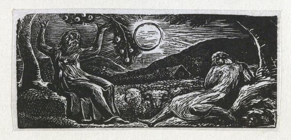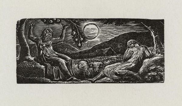 William Blake created this wood engraving, "Thenot Under Fruit Tree," to illustrate Virgil's "Pastorals." The stark contrast of black ink on paper immediately strikes you. Figures emerge from the darkness, framed by trees and a distant hill, all under a watchful moon. Blake employs strong, linear forms to define shapes and create a palpable sense of depth. The dense, almost claustrophobic composition, pushes figures and landscape into the foreground, challenging traditional perspective. The careful balance between light and shadow is not merely descriptive; it's expressive, imbuing the scene with a mystical quality. The semiotic interplay here is fascinating. Blake destabilizes the conventional pastoral idyll, offering a vision that hints at deeper, perhaps darker, undercurrents. The heavy lines and stark contrasts invite us to question the surface of the image, probing its symbolic meaning. Consider how Blake uses the formal constraints of the wood engraving to challenge our perception of nature and humanity’s place within it. This piece is not just an illustration; it is an interpretation of Virgil's text. It is a commentary on the relationship between the physical world and the spiritual realm.