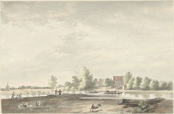 Curator: This is "A Landscape with a Church on the Horizon," a watercolor landscape by Nicolaas Wicart, dating from sometime between 1758 and 1815. Editor: It's a bit faded, isn't it? A very muted palette. Sort of washed out but there's something compelling about the way it centers the figures with these soft blurry lines and pigments in contrast with the precise architecture. I am curious, what type of pigment was available at the time and how it has aged to reach what we are seeing now? Curator: That subdued palette certainly lends it a sense of melancholy. The church is centrally placed; these symbols of community and permanence are standard during periods of intense social and political change and they usually point to some collective feeling for that permanence and order in the changing world. Editor: What does its process tell us about access? The texture and blending suggest a very calculated, painstaking process—materials accessible for someone privileged or wealthy but very costly, a limited edition almost like couture compared to mass-produced factory items, and it brings me back to think about this context and consumption during its moment in history. Curator: It is worth noting the artist, Wicart, worked in the tradition of neoclassicism at this time and, it is also labeled as genre painting so this might be showing everyday lives for this location with very controlled brushwork in an idealistic yet slightly bland approach compared to rococo art. I think, its power as a representation lies in that collective, somewhat sentimental desire for an imagined time of simplicity. The church becomes a beacon of continuity and belonging. Editor: But who is doing the belonging and labor for that place? Thinking again about the artist’s access, if he has no labor limitations compared to a common worker at that period or now. Curator: That's an important point. The image is very sanitized and only tells one facet. Editor: Indeed, this work prompts reflections on the production and context of the scene while it's been made—and how its value might shift now. Thank you! Curator: Absolutely. It is interesting to reconsider an apparently simple, soothing scene with a little more cultural, material insight.