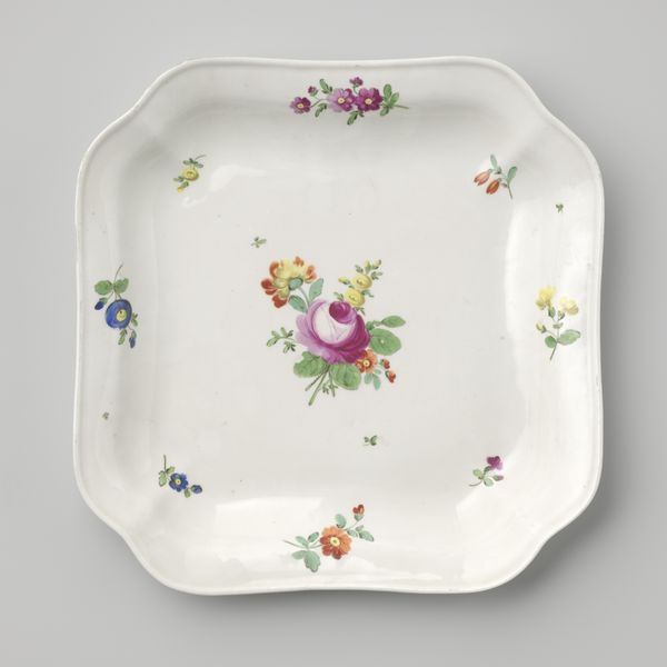 Curator: Before us, we have a delicately rendered saucer. Dating from around the 18th century, it is presented as part of the Minneapolis Institute of Art's collection. Editor: My initial response is how vibrant the colors are. There’s something so cheerful about the combination of reds, blues, and yellows on that pristine white porcelain. Curator: Absolutely. While created anonymously, it encapsulates elements characteristic of its period, and particularly reflects an interesting interplay between global trade routes and artistic interpretation. Considering the style known as Orientalism, what aspects of cultural appropriation might be present here? The floral motifs, for example, may have taken on new meanings through the process of exchange. Editor: The visual composition also catches my attention. The rhythmic distribution of the flowers—the clusters versus the individual blooms—creates a very pleasing visual experience, drawing my eye around the circumference of the saucer. The symmetry gives it a nice balance too. Curator: And further, in what social settings would such an object function? Was it part of a set used in elite circles, or was it accessible to a broader segment of the population? Considering factors of class, trade, and the artistic trends, we are allowed to interpret the symbolic meanings embedded in what might first appear as just simple, innocuous decorative piece. Editor: From a purely formal standpoint, I'm fascinated by the glaze—that smooth, almost glass-like finish—that would feel incredibly smooth and sleek to the touch. The way the colors pop against it makes the surface feel quite lively despite being a simple utilitarian shape. Curator: Precisely. Through a complex understanding of historical forces, aesthetic interpretation, and critical engagement, we enrich our appreciation for an item otherwise dismissed. Editor: Indeed. Analyzing its structural elements encourages an intimate, sensuous awareness of its being, allowing it to speak across time and culture.