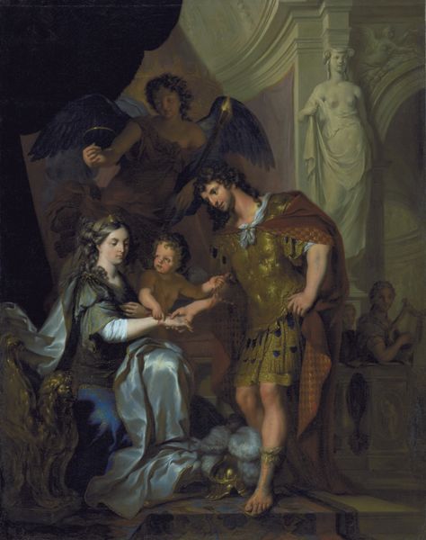 "Christian III Succouring Denmark" was painted by Nicolai Abildgaard using oil on canvas. Oil paint is made from pigment, suspended in a drying oil – usually linseed. This allows the artist to build up layers of color, creating the illusion of depth and texture. Notice how Abildgaard uses the smooth quality of the oil paint to depict the soft skin of the allegorical figures, contrasting this with the hard gleam of Christian's armor. Consider too, the labor involved in a painting like this. From grinding and mixing the pigments, stretching the canvas, and applying each layer of paint, a work like this was a huge undertaking, and a testament to the skill of the artist. By considering the materials and process, we can appreciate Abildgaard's painting not just as a historical representation, but also as an object of skilled craft and artistry.