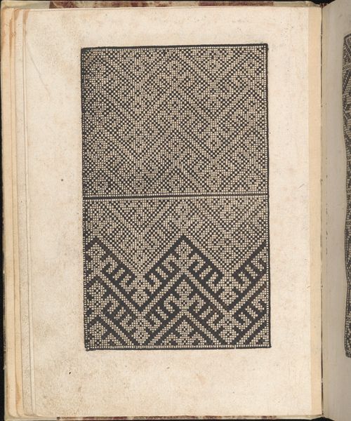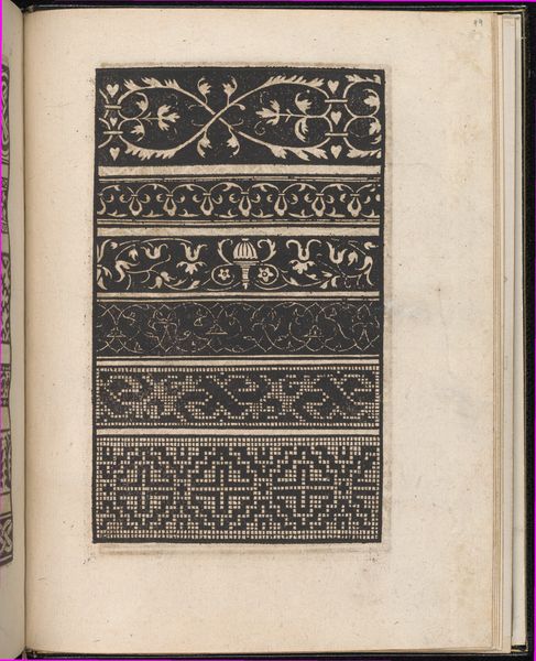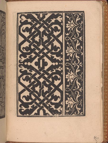 Editor: Here we have a page from "Ornamento delle belle & virtuose donne," or "Ornament for Beautiful and Virtuous Women," created in 1554 by Matteo Pagano. It's a print on paper, featuring geometric patterns. Looking at it, I immediately think, "textile design." The repeating patterns have a strong, graphic feel. What stands out to you? Curator: Well, beyond the obvious functionality – offering designs for embroidery and lacework, envisioning a lady in her chamber delicately following these patterns – I’m struck by the tension, right? Black and white locked in this geometric dance. Do you think that gives it a feeling almost...architectural? It transcends just simple craft, becoming a blueprint for societal harmony or perhaps an exploration of rigid social structure, of the role of women constrained within prescribed aesthetic boundaries. Or maybe I'm just reading into it after a long day! Editor: That's a fascinating idea. It's like the design isn't just for decoration, it reflects their entire life. Curator: Exactly! Or even pushes against it, these “virtuous women” perhaps using these patterns to assert some control in a world largely governed by men. You know, it’s almost like they're building their own little world. But how would you see it changing the world for them in practice? Editor: Hmm. I guess I had envisioned it in practice as much simpler and contained, but what you said is really thought-provoking. Curator: The Renaissance does that, right? Gives you the beauty on the surface and depth simmering beneath. These patterns contain much more than mere surface charm. What will you see the next time you look at such a drawing? Editor: I think, not just what it is, but what it meant and represented.