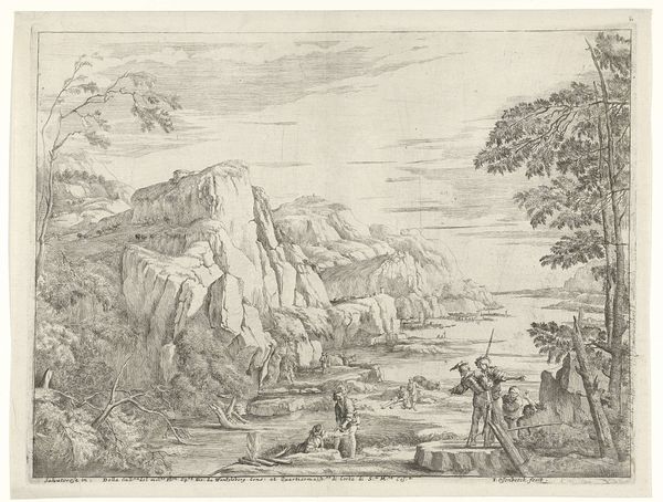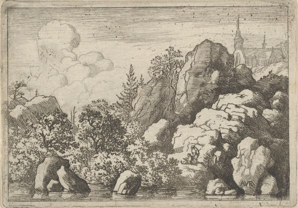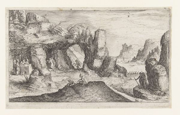 Editor: This print, "Elia gevoed door raven," made around 1625 by Crispijn van de Passe the Younger, really strikes me. The stark lines of the engraving create a desolate atmosphere, emphasizing the isolation of the figure. What is your take on this work? Curator: It's interesting to consider this engraving through a materialist lens. Let's think about the production. What kind of labor was involved in the making of the paper, the engraving, and the distribution of this image? It speaks to the economics of artmaking. These prints circulated widely; what function did it serve to have Biblical images made more broadly available, more *consumable* than paintings or even illuminated manuscripts? Editor: I see, so you’re interested in how prints like this democratized religious imagery by being easier to make and distribute? It makes you think about who had access to these kinds of images. Curator: Exactly! Also, let’s consider the subject matter. Elijah is being fed by ravens – divine provision in a time of scarcity. But whose scarcity? Understanding the specific historical moment when van de Passe made this informs the way we interpret the image's statement about class. Think about how representations of divine aid function in a society stratified by wealth. Is the image simply reinforcing established hierarchies, or are viewers invited to reconsider their places within it? Editor: That makes a lot of sense. The materiality and accessibility influence who gets to see the image and the meaning they take away from it. Curator: Precisely. Analyzing its means of production allows us to challenge notions of divine intervention and consumption. Material circumstances shape the narratives we inherit. Editor: This really opens my eyes to the importance of context. Thanks!