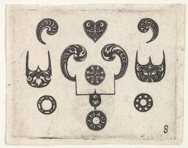 Claes Jansz. Visscher created this blackwork print with nine motifs in the 17th century, a time when the Dutch Republic was a global center for trade and art. These small-scale designs reflect a period where personal adornment and decorative arts were highly valued, and fashion signaled social status. Note how the motifs include geometric and organic forms, suggesting both the order and the abundance valued in Dutch society. Visual details, like the crown-like shapes, may have served as symbols of power and authority. Visscher’s work was part of a larger cultural trend where prints democratized art, making designs accessible to a wider audience. Consider how artisans used these motifs to embellish clothing and other items, turning everyday objects into displays of wealth and identity. The blackwork style, with its intricate patterns, demanded precision and skill, further enhancing the value of the adorned object.