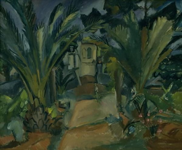 Curator: Pyotr Konchalovsky created this striking oil painting titled "Design for the opera by Wolfgang Amadeus Mozart, 'Don Giovanni'" in 1913. Editor: Wow, it hits you, doesn't it? The deep blues and greens, almost churning...It feels more like a dream of Don Giovanni, shadowy and intense, rather than a sunny stage set. Curator: Absolutely, that’s the Expressionist influence at play. While it’s a stage design, Konchalovsky’s personal artistic style and the context of Russian art history transform it. Instead of strict representation, we have emotional evocation through form and color. The 'World of Art' movement valued theater design for its own sake, not just as a background to performance. Editor: Makes me think about the power of opera, all those heightened emotions compressed into these moments. This image almost *smells* of the opera house—dust, old velvet, desperate longing! Is it me, or does that statue look kind of unsteady? Almost like it is melting a little… Curator: The dynamism is definitely intended. Expressionism aimed to reflect subjective emotions and responses. Konchalovsky pushes beyond pure visual accuracy and prioritizes the artist's, and by extension, perhaps Don Giovanni's psychological state. Notice how the cityscape seems to bend to his will, a little off-kilter. Editor: Like everything is at the mercy of Don Giovanni's desires? Makes sense. So it’s less about the set reflecting a real place and more about reflecting a state of mind? Sort of amazing that stage design could convey all that—or was ever intended to do so. Curator: Precisely! These designs were important social commentaries—reflecting society's concerns about its own identity, purpose, anxieties. By taking operatic figures out of simple scenery, he turns the spotlight onto the characters themselves. Editor: Well, whatever he intended, he nailed it. It’s both beautiful and a little unsettling—kind of how I feel after seeing Don Giovanni! Curator: Agreed. And isn't that a testament to its continued relevance? Editor: Definitely a piece that stays with you long after the curtain falls.