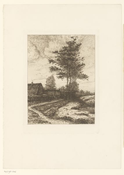 Curator: Immediately, there’s a feeling of stillness and maybe even isolation evoked by this small etching. It feels as if the wind might be blowing… do you feel that? Editor: It's undeniably quiet. A deep silence permeates everything. I can see in the picture that Jean Pierre François Lamorinière offers us, it is entitled 'Gezicht op het dorp Hockai in de Ardennen,' or, ‘View of the village Hockai in the Ardennes’, created sometime between 1838 and 1879. The original resides at the Rijksmuseum. Curator: Rijksmuseum. Yes. Its landscape has a dreamlike realism. The perspective leads me right into the village center... though 'center' might be too strong a word. It’s a crossroads more than a plaza. And the contrast between the road and the rooftops gives it almost a childlike quality, don’t you think? Like something rendered in an old fairytale. Editor: I do agree about the contrast. It certainly seems symbolic, and invites that interpretation. Village scenes often represent idealized community. What do you see in the actual forms used here? Curator: There’s a stark simplicity to them. You know, I often think artists who commit to etchings possess a certain courage. So much labor for, relatively speaking, so few lines. What can a line express? What CAN'T a line express? I’d rather live there than Manhattan, put it that way. Editor: I am definitely noticing the commitment to lines. There is an emphasis on capturing textures through hatching and cross-hatching. Light seems almost to shimmer. I imagine that Hockai, like many rural communities, held distinct symbolic meaning. As in, tradition and self-sufficiency, especially when framed against the emerging industrialism in other regions. What's particularly beautiful is that interplay, you know? That old battle of tradition versus… new ideas. Curator: Absolutely. It is what’s buried—just out of sight—that creates that pull, yes. This etching becomes, then, a preservation, or perhaps even an invocation of the ‘real’. Which might also speak to your original point—idealized, yes, but still, at its heart, grounded. And human. Editor: Ultimately, a meditation on place and memory, don’t you think? And our ever-shifting perception of both. Curator: Right, this silent vista is not just a place. It’s a little monument, yes? An intimate world within the confines of an etching.