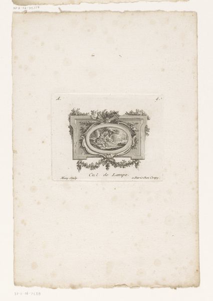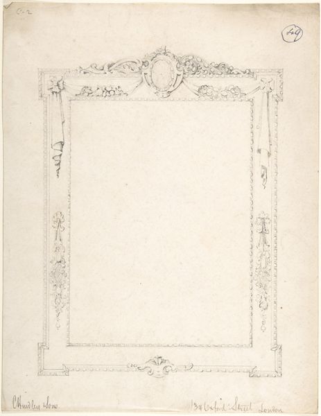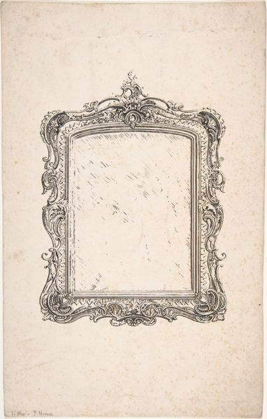 Curator: This delicate piece is "Spiegellijst," which translates to "Mirror Frame," created around 1836 by Charles Onghena. It's an etching, a dance of fine lines on paper, rendered in print and drawing mediums, which gives it this almost ghostly quality. Editor: It's incredibly ornate. I see this symmetrical frame adorned with twisting foliage and what looks like animal heads, almost lion-like, peeking out. The paper has aged to a soft ivory. I find its ethereal quality a bit haunting and yet incredibly inviting. Curator: I can see that. Romanticism often leans into that sort of feeling. Consider where art was at the time; romantic artists reacted against the cold reason of the Enlightenment by embracing feeling and subjective experience. The frame itself would have been a signifier of wealth, but one that is very intentionally adorned. Editor: What's intriguing is that the center of the frame, where one might expect a reflection, is left blank except for an almost pixelated looking grid pattern. What are we supposed to see here, a mirror image or something else? Curator: Exactly! I imagine it leaves the interpretation entirely open to the viewer. Are we supposed to project our own image into that void, to contemplate the very idea of the 'self,' framed by the societal structures represented by the elaborate decoration? Editor: The emptiness draws me in! It becomes a space for my own projections and imaginings. Without being confrontational, the lack of content feels defiant. I like how the paper’s aging gives the whole work a slightly surreal appearance, making you question its existence in real life. Curator: And this is what gives the print its quiet power. Etchings and engravings held a specific cultural role; this image would likely be available and potentially be seen as disposable. It wasn't meant to shock or provoke, rather, to suggest. Editor: I think that’s a very interesting element about the disposable imagery it provides as the material degrades over time, only deepening my awe. It holds time. Curator: And I find the choice of leaving it bare for speculation to be intriguing.