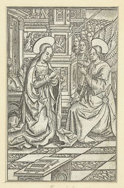 Curator: This work, currently housed at the Harvard Art Museums, is titled "Christ and the Magdalen" by Michel Wolgemuth. Editor: It's a tender scene, almost dreamlike. The colours are so soft and muted, giving it a sense of reverence and intimacy. Curator: Wolgemuth was a prominent artist during the late 15th and early 16th centuries. His workshop was instrumental in printing, so this piece represents his skill with line. Editor: There's such delicacy in the rendering of fabric, and yet, look at the Magdalen's face—a quiet defiance there. Curator: Exactly. Consider how this image challenged the era's rigid social constructs. It allowed for a woman, even a "fallen" one, to be seen in divine communion. Editor: It makes you wonder about the stories left unsaid, doesn't it? It also makes you feel the weight of unspoken emotion. Curator: Indeed. And in examining it, we understand a small part of the complex history of the period. Editor: For me, it's a reminder that art is always more than the sum of its parts: it’s a whisper of the soul across centuries.