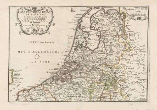 Curator: Here we have a fascinating French map of the Dutch Republic dating back to 1672. It’s intriguing, a web of borders etched in ink by an anonymous hand. I'm especially interested in how this era’s cartography blends emerging scientific accuracy with potent political messaging. Editor: Wow, talk about dense! At first glance, it feels less like a helpful guide and more like visual white noise. Like trying to find your car in a jam-packed parking lot – where do you even start? But there's an underlying beauty too. Curator: That intricacy speaks volumes. Consider the era: the Dutch Republic was facing invasion. Each line, each placename becomes a marker of power, resistance, or perhaps loss. Note the title cartouche—it’s practically overflowing with symbolic devices, flags, coats of arms. These weren't mere decorations; they communicated allegiances and aspirations. Editor: Absolutely. You’re making me see it in a new light. It's like the cartographer knew their audience had a different relationship with maps. I’m used to digital navigation where the whole world fits on a screen; back then, this level of detail wasn’t just information, it was also a piece of art meant to be studied and admired, even as an assertion of identity and threatened sovereignty. Curator: Precisely! And consider the very materials. The ink itself, the engraved lines pressed onto paper…it embodies permanence. An attempt to fix a fleeting political landscape onto something lasting, creating a kind of cultural memory. You see, even its rendering has a narrative depth, almost literally grounding anxieties and power struggles into the physical earth. Editor: You've got me thinking about what was happening when it was made—like trying to map shifting sands, capturing something essentially unstable, this reminds me that borders aren’t solid, tangible things at all; they're constructs of conflict and negotiation. The act of charting becomes a political statement in itself. It begs us to think—who makes the maps? And for what ends? Curator: Exactly! This map becomes less about geography and more about ideology. Looking at the detailed pen work is an opportunity to contemplate the relationship between land, power, and identity at a very turbulent moment in history. Editor: This really has transformed my perception. From something initially overwhelming, I see layers of meaning, fragile strength expressed through cartography. I guess even maps can be mirrors reflecting back more than just location.