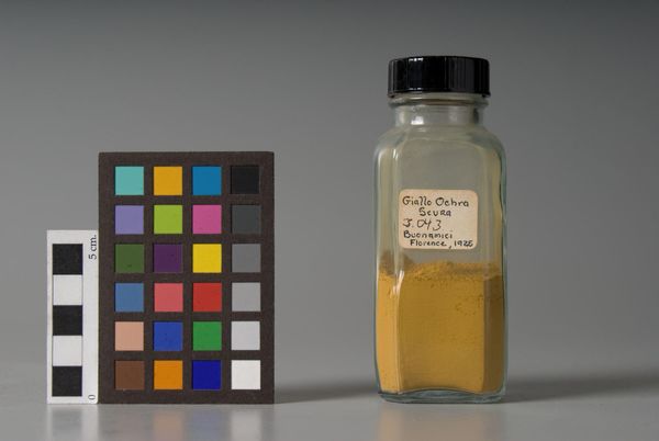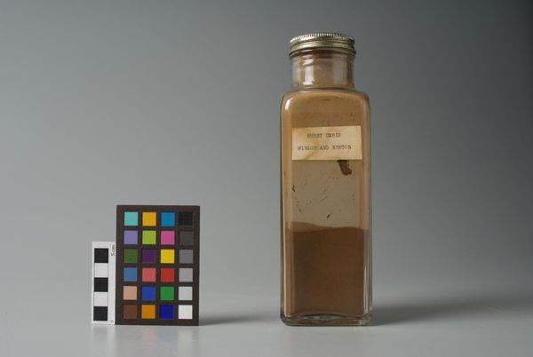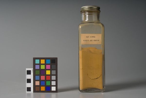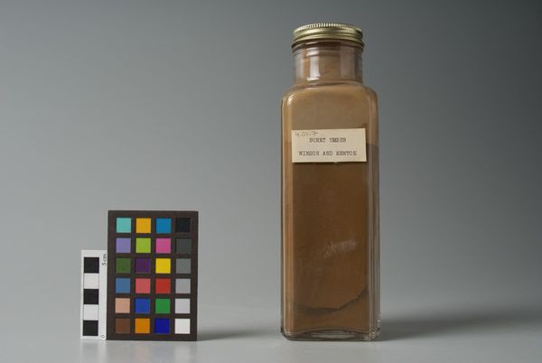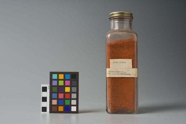 Editor: Here we have Burnt Sienna, by Tizian Color Co. It's just a bottle of pigment, but I find it so compelling! What story does this unassuming object tell? Curator: It speaks to the industrialization of art. Consider the labor involved. The pigment was mined, processed, packaged, and distributed. It shifts our focus to the means of production, don’t you think? Editor: Absolutely. It forces us to acknowledge art's connection to broader economic systems, but what about the color chart to the left? Curator: The chart becomes a critical tool, a standardization device in color production and how it aids in consumption of color. Now, how do you see the chart in relation to the pigment? Editor: That's a great point, I'm starting to look at the pigment as a mass-produced item. Thanks for your perspective.
