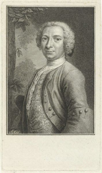 Editor: We are looking at "Portret van Govert Klinkhamer," dating roughly from 1716 to 1761, by Pieter Tanjé, currently residing at the Rijksmuseum. What strikes me immediately is the incredible detail achieved with what I presume are etching or engraving techniques. What elements of its formal structure do you find most compelling? Curator: Note the exquisite interplay between positive and negative space, a deliberate strategy of composition. The artist utilizes the oval frame not merely as a boundary but as a crucial formal element, which guides the eye around the composition. What effect does the subject’s gaze, directed outward, have on your interpretation? Editor: I suppose it implicates the viewer. It is as if he is contemplating something while inviting us into that moment of contemplation. Curator: Precisely. Consider also the tactile quality conveyed through the medium. The varying densities of lines create subtle gradations of tone, imitating the texture of skin and fabric. The use of hatching and cross-hatching constructs a sense of depth within the two-dimensional plane. Editor: It’s amazing how he achieves so much with what looks like a limited palette. Do you think the subtle gradations relate to other characteristics? Curator: One might even argue the absence of vibrant color directs the focus towards the purity of form and the intricacy of line, foregrounding the internal dynamics of the image itself. A compelling, formalist statement, don’t you agree? Editor: I certainly do. Looking at it through this lens, I appreciate how the artist compels our observation and interpretation. Thanks!