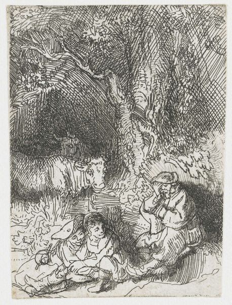 Rembrandt van Rijn created this print, "The Sleeping Herdsman," using etching techniques. The composition is a masterclass in organizing dense detail within a small space. The artwork depicts a pastoral scene dominated by a large, overshadowing tree, its foliage rendered with a tight network of lines. This intricate linework creates areas of deep shadow that contrast sharply with the lighter, open spaces, drawing the eye across the image. We see figures nestled at the base of the tree, their forms suggested through the same delicate, interwoven lines. The texture of the print is rich, the varying densities of etched lines producing a tactile quality that invites close inspection. Rembrandt challenges the viewer to look carefully, to decipher the forms within the intricate web of marks. He masterfully creates the illusion of depth and form through purely linear means. The result is a dynamic interplay between light and shadow, where figures emerge from and recede into the darkness, thus creating a visual experience that is both intimate and immersive.