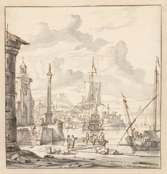 Abraham Storck the Elder created this drawing, "The Port of Livorno" in 1674 using pen and grey ink with grey wash. As you look at this busy port scene, remember that in the 17th century, Livorno was a bustling hub for global trade and cultural exchange. Storck, a Dutch artist, likely never visited Livorno. Instead, he relied on imagery circulated by other Northern European artists who were eager to represent this Mediterranean port. Here, Storck offers us not just a picturesque scene but a window into the complexities of global commerce, where goods and cultures intermingled, and labor sustained this prosperity. Note the diverse figures, sailors, merchants, and laborers, each playing their part in the port's economy. Storck's drawing invites us to consider the human element behind the grand narratives of trade and empire. How did individuals navigate this complex web of exchange, and what impact did it have on their lives? The emotional weight of separation and the thrill of cultural exchange are palpable in this scene. The drawing makes us question what stories are not shown.