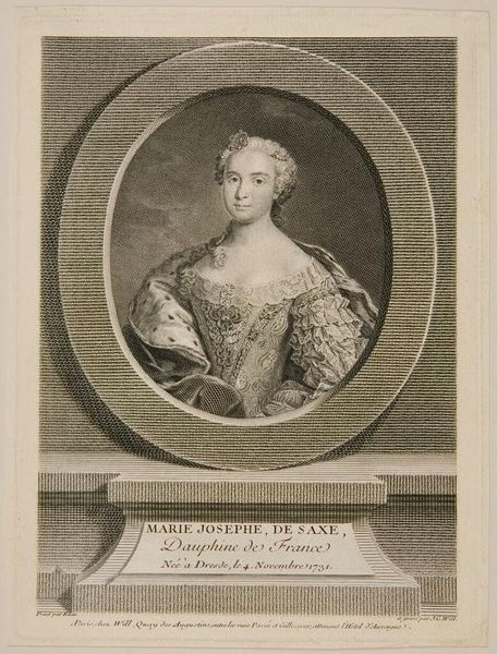 Curator: At first glance, there's a delicate formality to this portrait. It feels very controlled and precise. Editor: Precisely! What we have here is Johann Georg Wille's rendering of "Marie Therese of Spain, Eldest Daughter of the King of France." It's an engraving, a reproductive print actually, immortalizing royalty, designed for wide distribution. Curator: So, its very existence underscores the power dynamics of the time. What does it say about the role of women, specifically, in maintaining dynastic power? Editor: This piece emphasizes the role of visual representation in constructing and reinforcing gendered expectations. She's presented as a poised figure, embodying the qualities desired in a future queen. It speaks to the cultural currency of the female image. Curator: It’s fascinating to consider how this image worked to shape public perception and reinforce social norms. Editor: Indeed. A glimpse into the intersection of art, gender, and the construction of power.