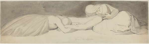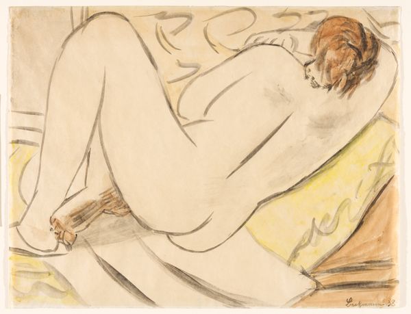 Curator: What a vulnerable pose. There's something very human, almost raw about it. Editor: It's intriguing isn't it? This is Cyprián Majerník's "Reclining Female Nude" from 1931. The artist used watercolor and drawing for this. It is clearly romantic in its way. Curator: Romantic... I see what you mean, in the way the light falls on her form, it seems a bit idealized maybe. Yet, that gestural drawing brings the image back from feeling idealized to grounded and somehow more present. Editor: Right, and the colour choices—warm browns and touches of reds and white—really contribute to this dreamlike quality, perhaps almost recalling classical art? The nude has a strong and continued symbolism. I believe it stands for both openness and self-knowledge. I find this a very striking image. What do you feel the emotional message from it is? Curator: For me? The woman's head is turned away; maybe it's a shielding, a desire for privacy in a state of exposure. Or perhaps it is as simple as quiet moment with oneself... Editor: That's beautiful, thinking of it like that, it's as though we’ve intruded into her thoughts somehow. In so much historical artwork women exist for others, yet this could easily represent privacy and contemplation. Curator: The incompleteness also adds something special, does it not? It's like catching a fleeting thought, a whisper of beauty instead of a grand declaration. Editor: Exactly. Perhaps this is about memory itself—fragile, fleeting, but deeply felt.