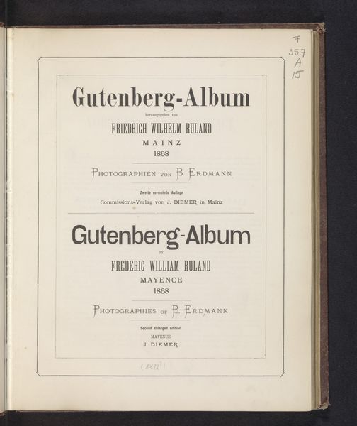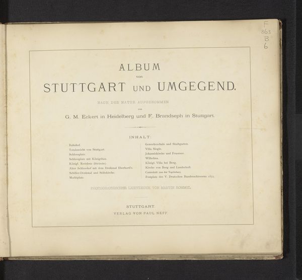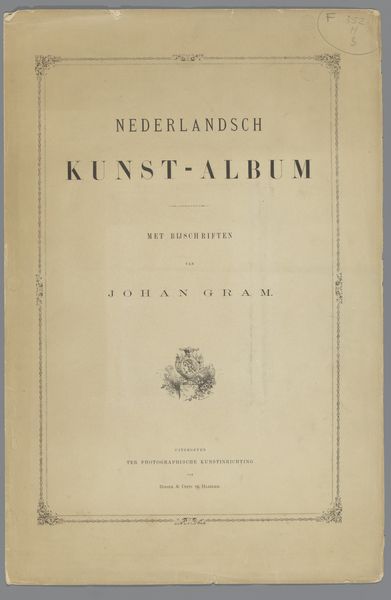Curator: It’s hard to miss the directness of this typography. The cover for "Kunst-Album door W. P. van Geldorp eerste aflevering 1869" declares its presence rather boldly. I'm struck by its plainspoken character. Editor: My first thought is of a bygone era, of course. All those tight letterforms...The poster feels almost academic. It's definitely announcing something important, right? Curator: Indeed. Produced in 1869, this poster, predominantly typography, announces the first installment of "Kunst-Album" by W. P. van Geldorp. The inscription below the title indicates the process "ontworpen en op steen gebragt," telling us it was designed and transferred to stone, suggesting a lithographic print. It gives insight to art reproduction’s earlier days, doesn’t it? Editor: Yes, especially in terms of how closely tied art was to the trades – and to technical processes and the availability of the equipment. What draws my eye is how meticulously crafted the fonts are. The design of the script seems to mimic old engraving styles to create a feeling of prestige. Curator: Look closer, and you can even find references in the table of contents itself! Mentions of weaponry in England, costumes of the 14th century... It sets out this grand tableau of both craft and history, really. The combination speaks volumes of how they might have defined "art" at that time. Editor: Those details really anchor this piece within its own specific symbolic world, right? References to Petrarch, the use of allegory... it’s hitting a particular intellectual tone for its audience. Curator: I'd suggest there is also something quietly revolutionary happening here. Note the overt display of artistic labour combined with references to high art: It quietly dismantles the class system embedded within art itself. Editor: Interesting! Perhaps it was attempting to create an artistic canon available and understandable to more people. Thanks to our chat, I find myself connecting with the spirit of artistic exploration from that time, even more deeply. Curator: It is precisely this bridge that I hoped we might construct today. A fascinating glimpse into a specific point in history of artistic output!