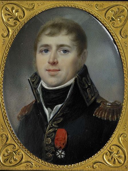 This is an anonymous painting of Arnold Adriaan Buyskes, Commissaris-generaal, made with oil on panel. It presents a tightly framed portrait of Buyskes, set against a muted brown background. The subject's formal attire, dominated by a navy coat with gold embellishments, immediately signals authority and status. The artist employs a traditional composition, focusing on the face with meticulous detail. Note how the artist uses the play of light and shadow to model Buyskes's face, capturing a sense of his individual character. The precise brushwork and the smooth finish contribute to a sense of realism, while the symmetry of the composition conveys order. The square format challenges the conventional rectangular framing of portraits from this period. This disruption invites us to consider how such formal choices can destabilize established meanings, prompting a re-evaluation of portraiture's role in representing power and identity.