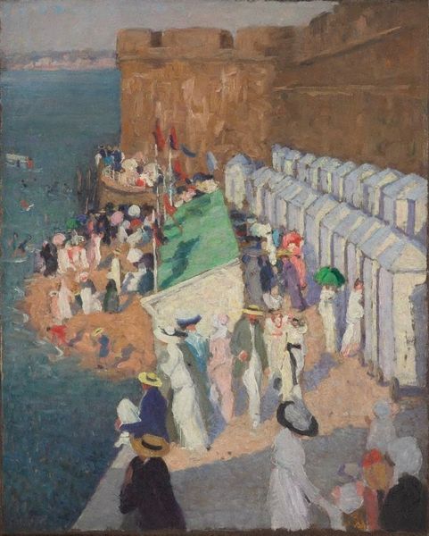 Curator: Standing before us is George Bellows’s "Beach at Coney Island," painted in 1908. Bellows was a prominent figure in the Ashcan School movement. Editor: It’s wonderfully chaotic. It feels like Bellows has bottled the feeling of a hot, crowded summer’s day. The overall color palette is creamy and sun-drenched. I immediately feel the slightly gritty sand under my bare feet. Curator: Absolutely, that tactile sense is key! He masterfully captures the energy of Coney Island. Notice how he doesn’t shy away from showing the common people at leisure, a departure from traditional landscape painting, right? It feels like a real slice of American life. Editor: Indeed, but beyond just a “slice of life,” I’m fascinated by how Bellows uses those striped tents in the background. Their stark geometry seems almost unnatural amongst the swirling mass of bodies. I wonder if they symbolize the organized escape from the city versus the liberating wildness of the shore. Curator: Fascinating idea! The parasols, the dark bathing costumes against the bright sand, create a staccato rhythm of dark and light that carries your eye across the canvas. It's about visual intensity, that frenetic joy that perhaps only a crowded beach can give you. The overall brushstroke creates a very loose impressionist landscape, where you see all the subjects of his works melting in the same hot sunny day, and also it may symbolize life. Editor: And isn't it interesting how he focuses mostly on children? They dominate the foreground, playing, hugging, almost indifferent to us viewers. Children always hold such potent symbolic weight. They are a glimpse of purity and future potential, but perhaps also a kind of social commentary, observing their lives. What symbols do they carry? What futures might lay ahead for them? Curator: Very evocative question, their youth against the transient summer scene only deepens the mystery! Bellows isn't just documenting; he’s provoking feeling through these candid observations of people at leisure. In this painting Bellows captures something genuinely affecting and familiar. It’s both an ordinary moment and, simultaneously, a complex commentary. Editor: Indeed, Bellows’ vision really pulls you into that moment in time, an experience now somehow frozen. Thank you for bringing this fascinating image into such vivid perspective!
