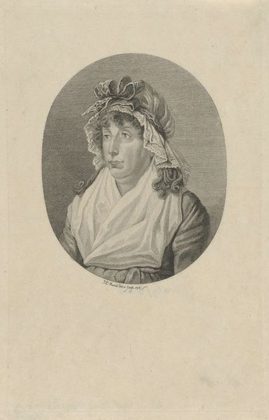 Editor: This is "Friederike Brun," a lithograph print from sometime between 1820 and 1843, currently at the SMK in Copenhagen. I find the starkness of the print and her elaborate bonnet somewhat contrasting. What do you see in this piece? Curator: I see a fascinating intersection of class, gender, and representation in this portrait. Consider the subject, Friederike Brun: a woman of letters in a society that often confined women to domestic roles. This print, a lithograph, made her image more accessible. How do you think that democratization of the image impacted her status, both as a woman and as an intellectual figure? Editor: I suppose it made her more visible, maybe even challenged the existing power structures a little? Being able to circulate her image… that’s pretty powerful for the time. Curator: Precisely! And notice the Romantic style—it wasn't just about aesthetics. Romanticism questioned Enlightenment rationalism. Friederike Brun, as a Romantic figure, would be seen as a challenge to traditional, patriarchal structures that relied heavily on 'reason' to justify their power. Who got to be reasonable? Who got excluded? Editor: So the portrait isn't just a likeness, but almost a statement in itself? Curator: Exactly. Think of it as a quiet act of defiance. Even her elaborate bonnet, as you pointed out, can be read as a symbol of both confinement and display, reflecting the complex position of women in society. It calls for analysis of how we negotiate imposed identities and reclaim spaces within those constructs. Editor: I never considered all these factors when looking at a portrait before. Thank you! Curator: Of course! Seeing art through a critical lens helps us to decode the complex cultural narratives embedded within each piece.