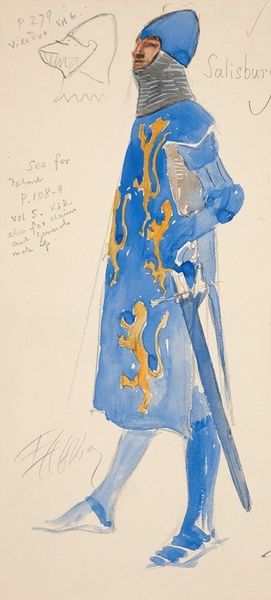 Edwin Austin Abbey made this watercolor costume sketch for Henry Irving’s planned production of Shakespeare’s King Richard II. The image offers insight into the cultural reception of Shakespeare in late 19th century Britain, where historical accuracy was increasingly valued. Irving, a prominent actor-manager, aimed to create historically plausible productions. Costume designs like this one resulted from research into period clothing, reflecting a growing interest in the material culture of the past. The sketch suggests a self-conscious effort to evoke a sense of historical authenticity. By examining archival materials such as playbills, theatre reviews, and costume inventories, the social historian can further illuminate the cultural values and aesthetic preferences that shaped theatrical productions of Shakespeare during this period. Understanding the institutional context helps us appreciate the changing ways in which the past has been presented and interpreted on the stage.