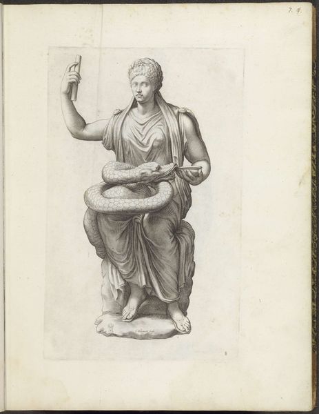 This drawing of a standing woman was made by Hubert Quellinus. The composition is dominated by the figure’s form; its lines are fluid, creating a sense of movement and softness. The texture is rendered through delicate hatching, providing depth and volume. The shading defines the contours of the body and the drapery, adding to the sculpture-like quality of the figure. The absence of color focuses attention on the interplay of light and shadow and the purity of form, emphasizing the Neoclassical ideals of simplicity and grace. The form is classical yet fragmentary, perhaps alluding to the nature of classical works as objects of cultural and philosophical ideals, even in their incomplete state. These absences destabilize the completeness of the work, inviting questions about what is missing and what that absence might signify. The drawing's beauty lies not only in its aesthetic appeal but also in its capacity to reflect broader cultural and philosophical discourses about classical ideals and the incomplete nature of cultural heritage. It reminds us that art is not merely a static object but an evolving dialogue between past and present.